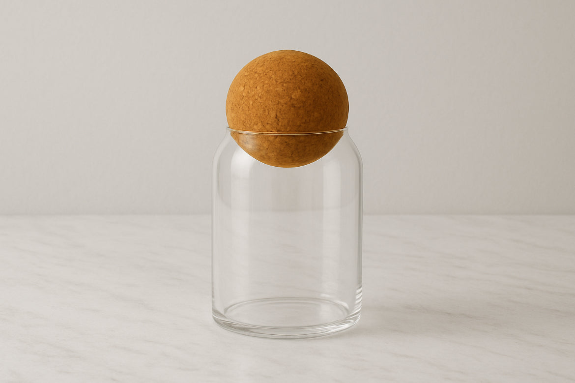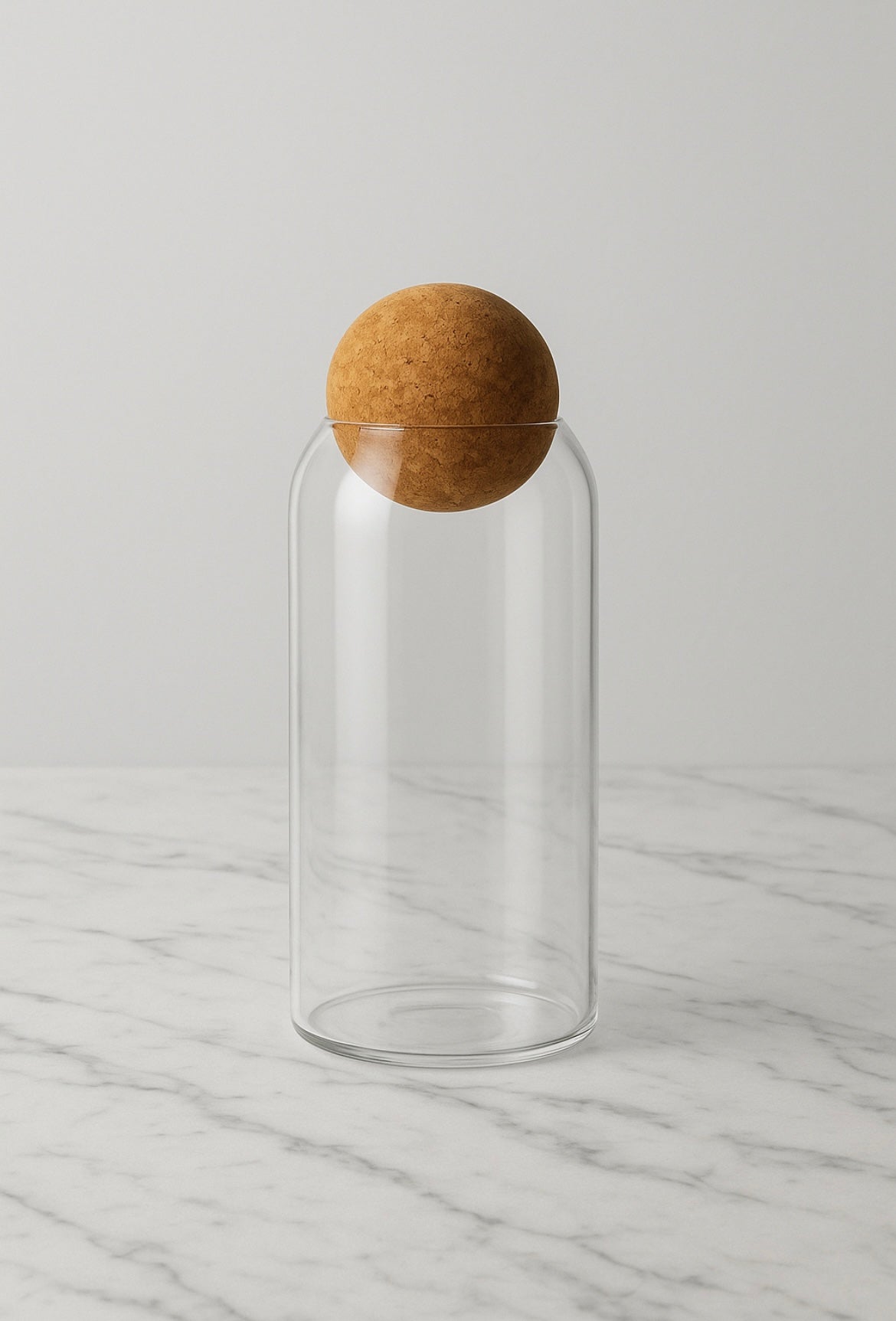 Elegantes Vorratsglas aus klarem Glas mit natürlichem Kugelkorken. Drei Größen (400 ml, 650 ml, 900 ml) für stilvolle Aufbewahrung von Kaffee, Tee, Pasta und mehr. Langlebig, BPA-frei und dekorativ – perfekt für moderne Küchen.